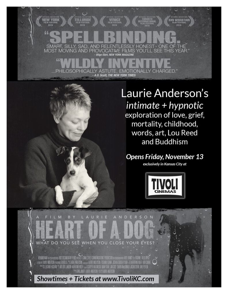12191114_10153232129466593_2190430478651855880_o Published November 10, 2015 at 1275 × 1650 in Wednesday MidDay Medley welcomes the staff of Josey Records Kansas City + Jerry Harrington on Laurie Anderson’s HEART OF A DOG HEART OF A DOG opens at The Tivoli on Friday, November 13.