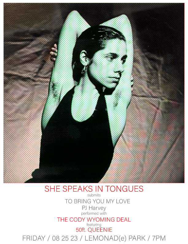 ALSO next week on August 23 Kate McCandless and Cody Wyoming join us to share details about SHE SPEAKS IN TONGUES submits: PJ Harvey’s To Bring You My Love W/ THE CODY WYOMING DEAL, Friday, August 25, 7:00 PM at Lemonaide Park, 1628 yomoing Street, KCMO – WEST BOTTOMS, featuring 50ft. QUEENIE. SHE SPEAKS IN TONGUES is Kate McCandless- vocals, performance, percussion // CODY WYOMING DEAL is Cody Wyoming- guitar, Organ, Synth, backing vox. Matt Richey-Drums, Justin Muschinske – bass, Baritone, Organ, Guitar, Synth; J. Howell-Guitar, prepared Guitar, Sound Design; Katie Gilchrist- backing vox, percussion, keys // 50ft. QUEENIE is Chris Meck on guitar, Brandon Phillips on Guitar, Adam Phillips on drums, Chris Wagner on Bass.