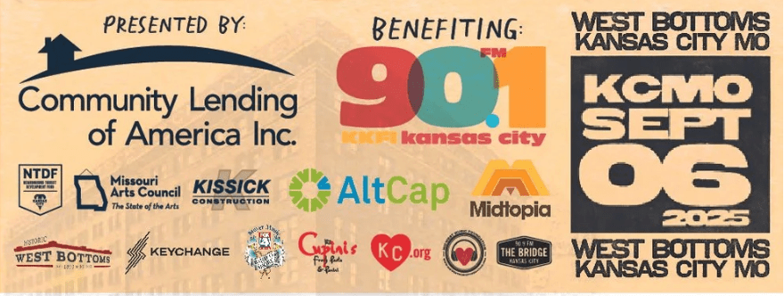 Sponsors: Community Lending of America + 90.1 FM KKFI + Neighborhood Tourist Development Fund + Missouri Arts Council + Stockyards Brewing Co. + Midtopia, West Bottoms Whiskey + Kissick Construction + Midwest Music Foundation + Historic West Bottoms + North Kansas City Beverage Co. + The Kansas City Beacon + 90.9 KTBG – The Bridge + KC.org and Cupini’s